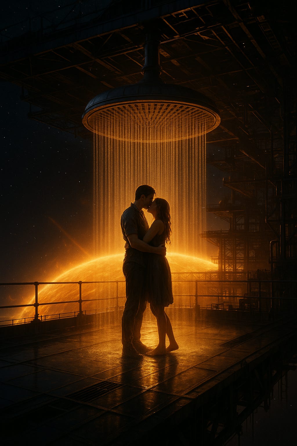 I dreamed it was way in the future and there were these giant floating oil rigs but they weren't mining oil they were mining sunlight to use to grow things all the rig workers, instead of oil and grease on their hands they had burned parts of their gloves and sunburns on small spots of their skin. and I woke up with you and it was in the future and we stumbled all over this place, lost trying to figure out where we were and ended up on one of these sunlight rigs and it was so dark and you could see so far into space and the city lights and we were FILTHY and exhausted so the rig guys let us use their shower and the shower was outside on the edge of the floating dock thing and was this giant showerhead GIANT that rained on you it was like the size of a house and it just poured down warm rain and you could see the stars through it and we just stood there in the shower staring into the space and every now and then the sunlight rig would catch some sunlight and the whole rig would shake it had a FEEL you could FEEL the warm and feel the orange and for a moment it didn't matter how far from home we were, how far from Now we were, it just felt ok. we just stood there holding onto each other and staring through the water into the starlight.