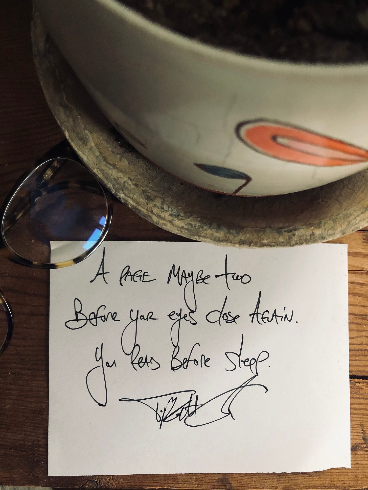 A page, maybe two, and I watch each night with a smile. Sometimes, when she’s not the energy to even close the book, I quietly reach over, close the book, remove the glasses, and say goodnight.