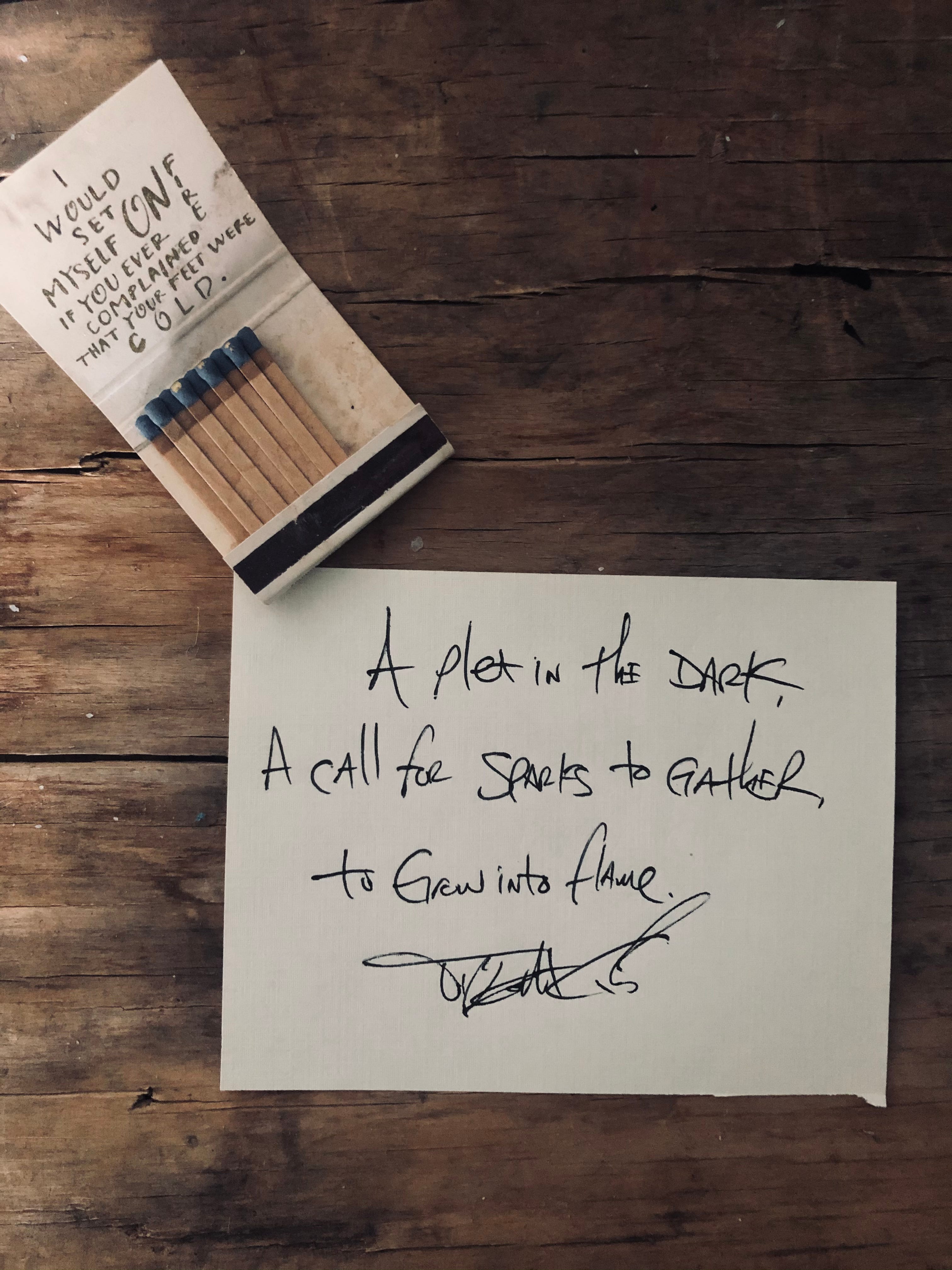 There are others around, more like us, you know this don’t you? You’re not alone here, you never have been, you are one dancing spark off a torch dripping over a river dark. They rise as you rise, float like alive, play in the night air like lightning bug, catch sight of their own reflection in the moving water and wonder at their shape. There are more of us, many enough to call us everywhere, and we can find one another again. We can combine into one thing again, shine out like flame and illuminate the rest of this place. This is a plea in the twilight, a call to the embers that ride wind gusts and breeze, this is a shout across the valley, to the mountaintops, to the sea beyond, to gather. Come near, we echo, for we are. Come near, we holler into the places blanketed in cloud and rainfall, let us grow into flame.