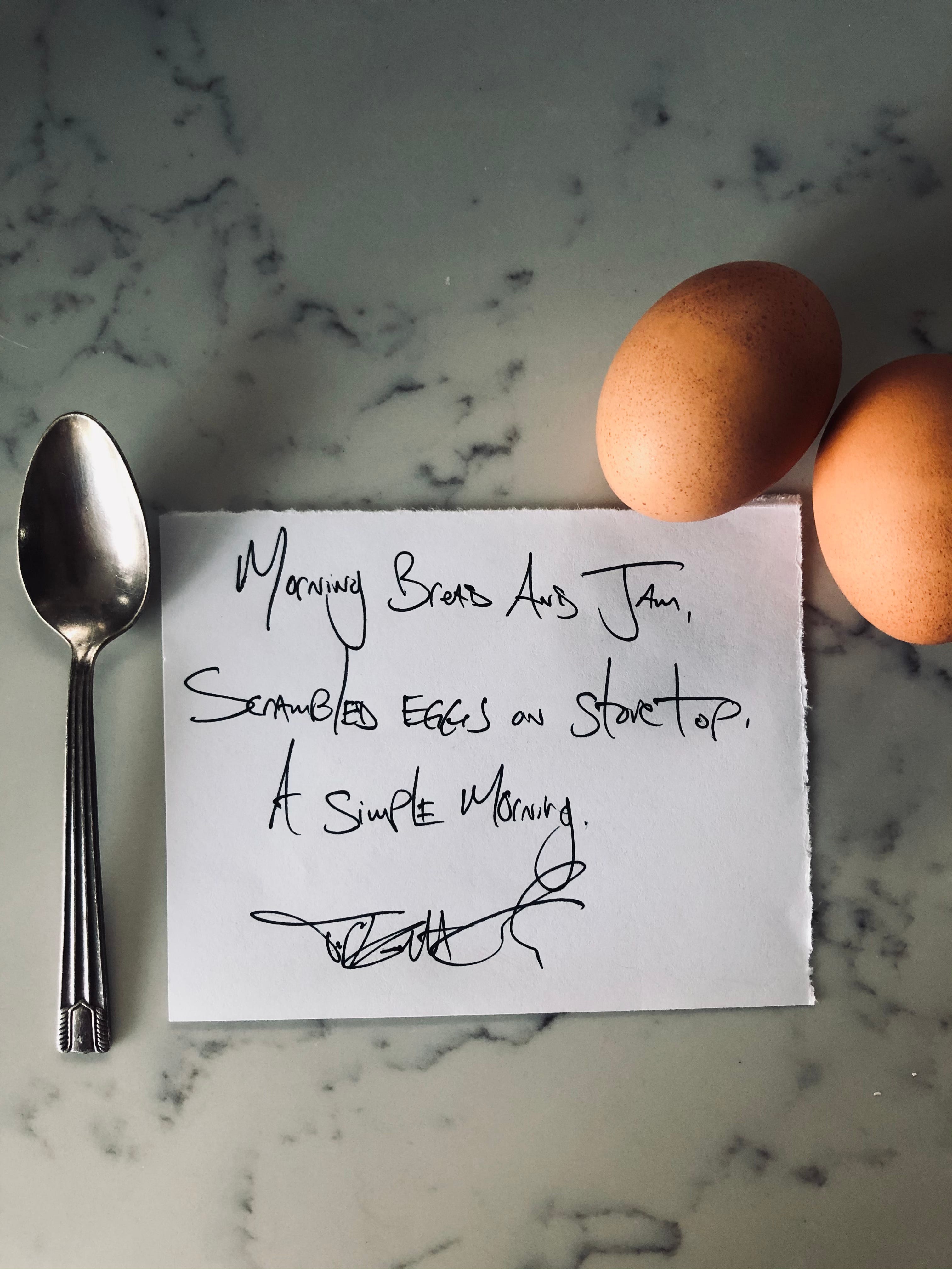 Scrambled eggs (of which I must say I may make the finest you’ve ever eaten), two slices of toast with a little raspberry jam, a hot mug of green tea, and a conversation with my wife in sleepy thunder morning voice, and it begins. I notice the texture of the eggs whilst cooking them, the smell of the bread as it browns, taste the sweetness of the jam mixed with the savory Irish butter. I feel the heat from the tea in my throat. This is where I begin, and it pushes me forward in a slower, simpler way.