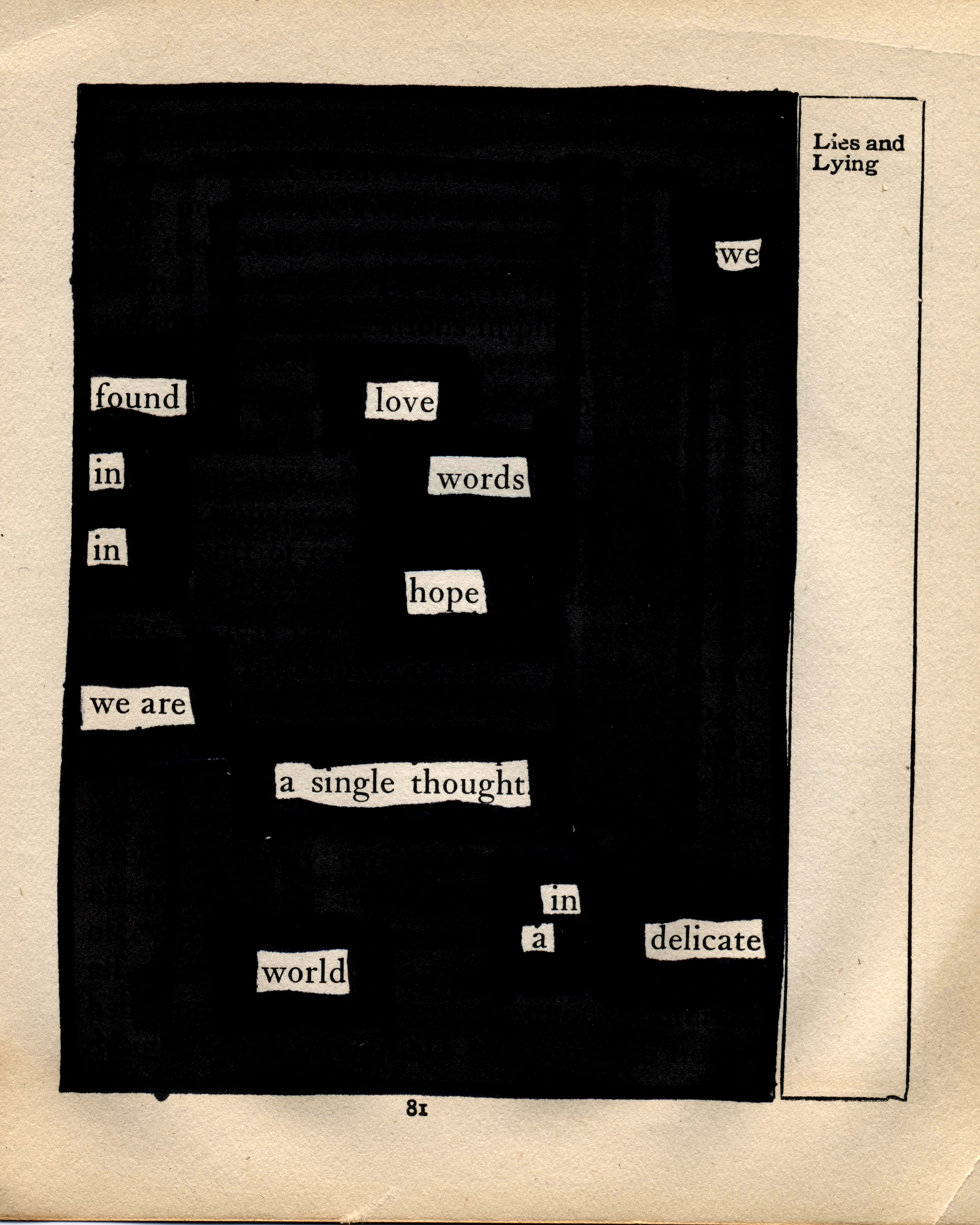 I will not sugarcoat things, I will not try to lie to you (how funny that the blackout poem comes from a page called “Lies & Lying) and tell you that times have not indeed been bleak for quite a long time. We’ve endured, as a nation, as a planet, more hardships than we’re all collectively built to handle, and the next few days are indeed frightening.
