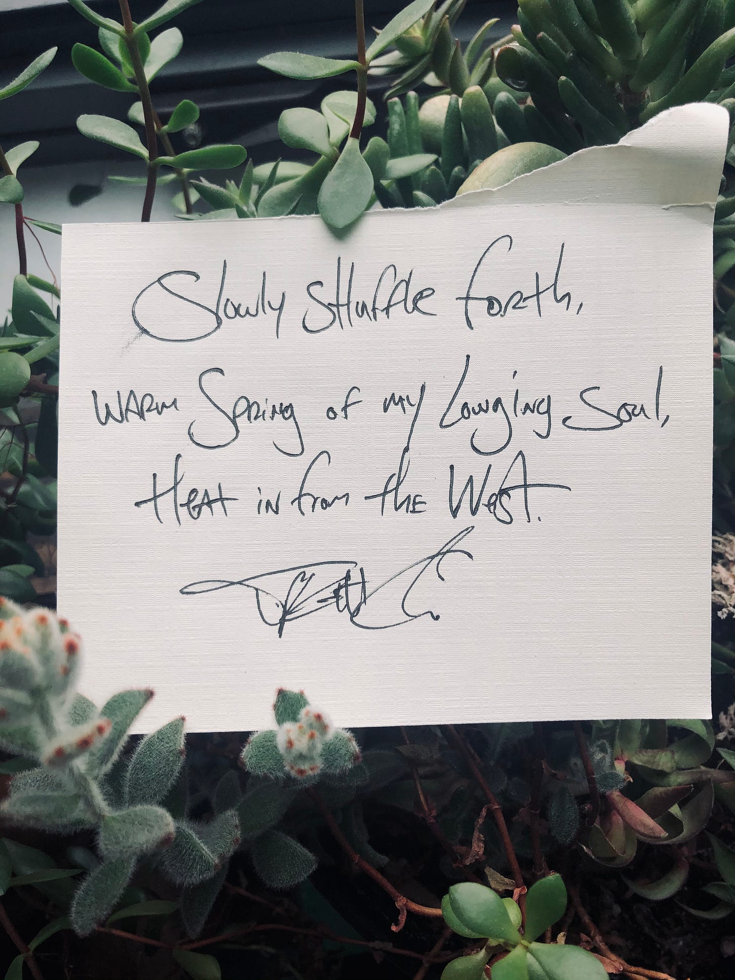 Slow thing, Springtime. Slow enough to call it painful, excruciating even. What they don't tell you, is that there’s a Springtime to our soul, as well. It’s more than just weather, more than the first bit of breeze on our t-shirt arms, it’s a thawing of all that froze inside us during the Winters we swear will never end. We stand at the edge of our front porches and shut our eyes, thinking if we cannot see, we can feel it sooner. Warmth is felt first, we say to our frostbitten selves, and search out the red glow on the backs of our eyelids. We wait for heat in from the West.