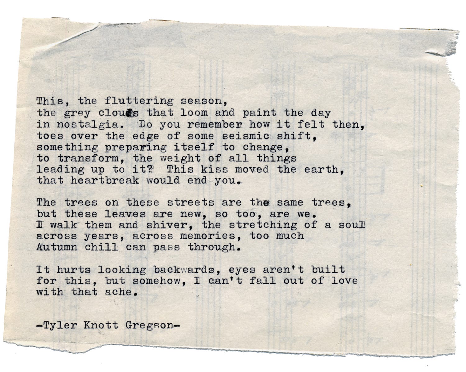 I am pulled to it, and while the warming of our global has prolonged the Summer that precedes it, I know each year that Autumn will come, that it will spread its fingers, skeletal and almost icy, and when it does I will be left sitting on porch with eyes closed and head slightly back, I will be inhaling the cool, wet air, and I will be remembering.