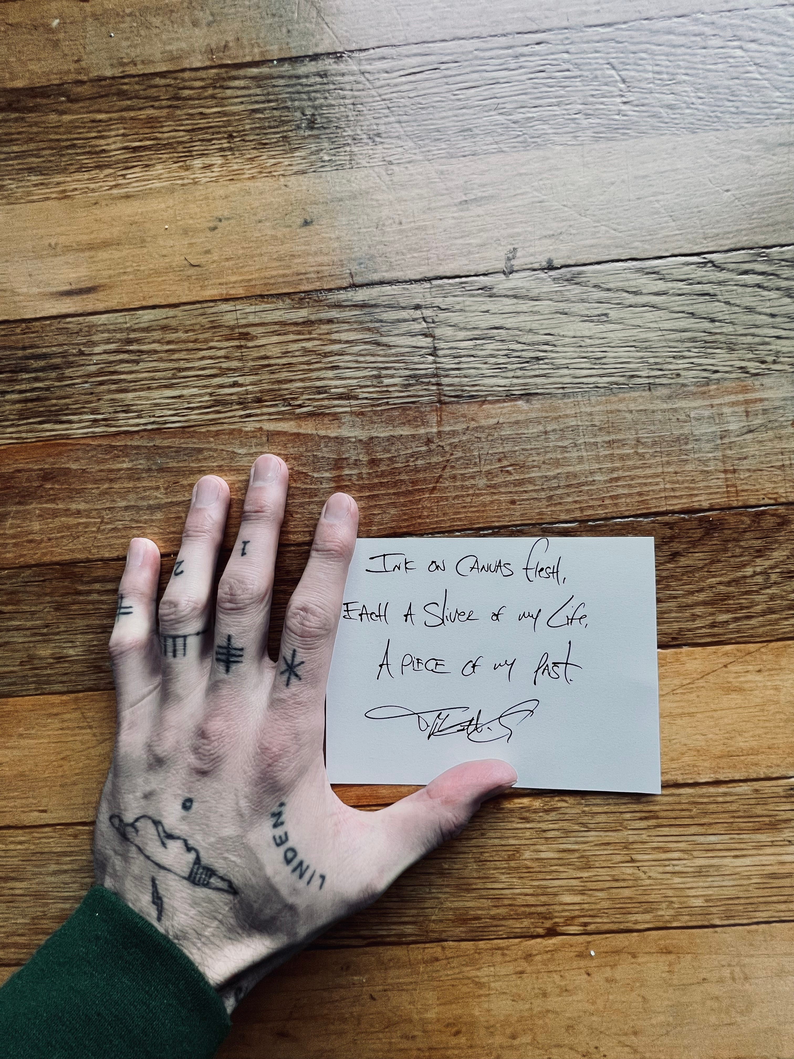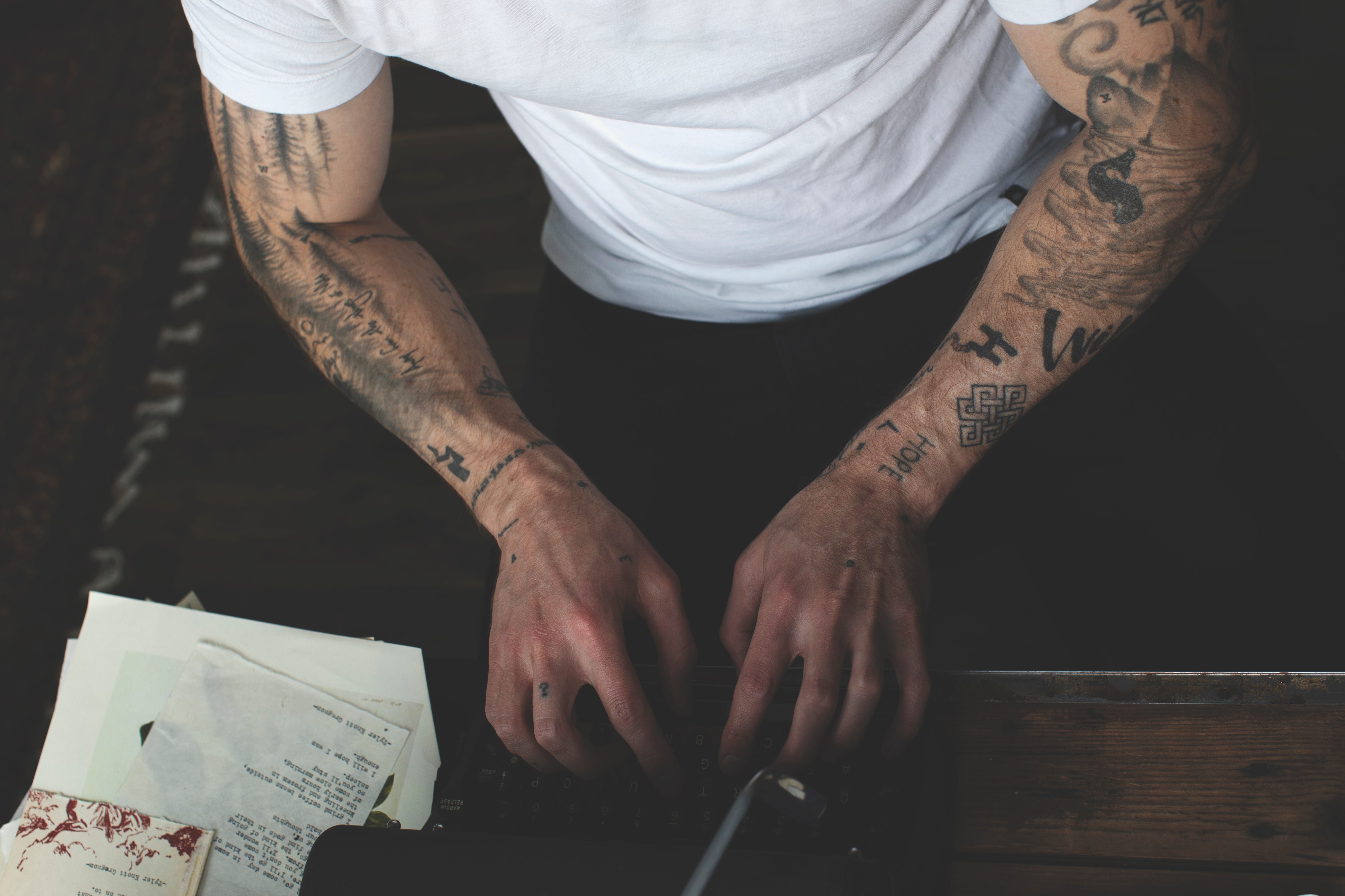 For me, tattoos are memories. Tattoos are placeholders, they are bookmarks, they are highlighted sentences of a life. For me, they all add up to meaning something else, and every single time I see them, I remember. Tattoos mark significant occasions — I have one for people in my life I’ve lost, I have them for each different book I’ve had published, I have them for places that took my breath away — and they bring me back to exactly where I was, exactly who I was when I received them. I got my first as a dare with my best friend, Greg, when we were only 18 years old. The parlor that did it was terrifying, she tattooed far too deep and left scar tissue that later had to be tattooed over and broken up (ouch, really ouch, trust me) before it could be fixed and covered up by a much bigger, more meaningful tattoo to me. I am tattooed all over my body, from my fingertips to my shins, and strangely, I’ve never been one for giant pieces, instead opting for the more ‘stamp’ like tattoo style where each memory gets its own place, its own reason. I have letters from my typewriter, I have Ogham letters from the ancient Celtic language, I have swallows and ravens, lightning bolts and storm clouds, I have drawings Sarah made me at special times, I have a light bulb from the very first love note she ever left me. I have the name of friends that have passed away, I have quotes from my favorite films, books, and songs, I have a drawing my best buddy Gregory Alan Isakov drew me just to get tattooed. I am covered in ink, and every single drop tells a different story. When I see them, I know these stories, when others see them, if they wish to know, they need only ask.
