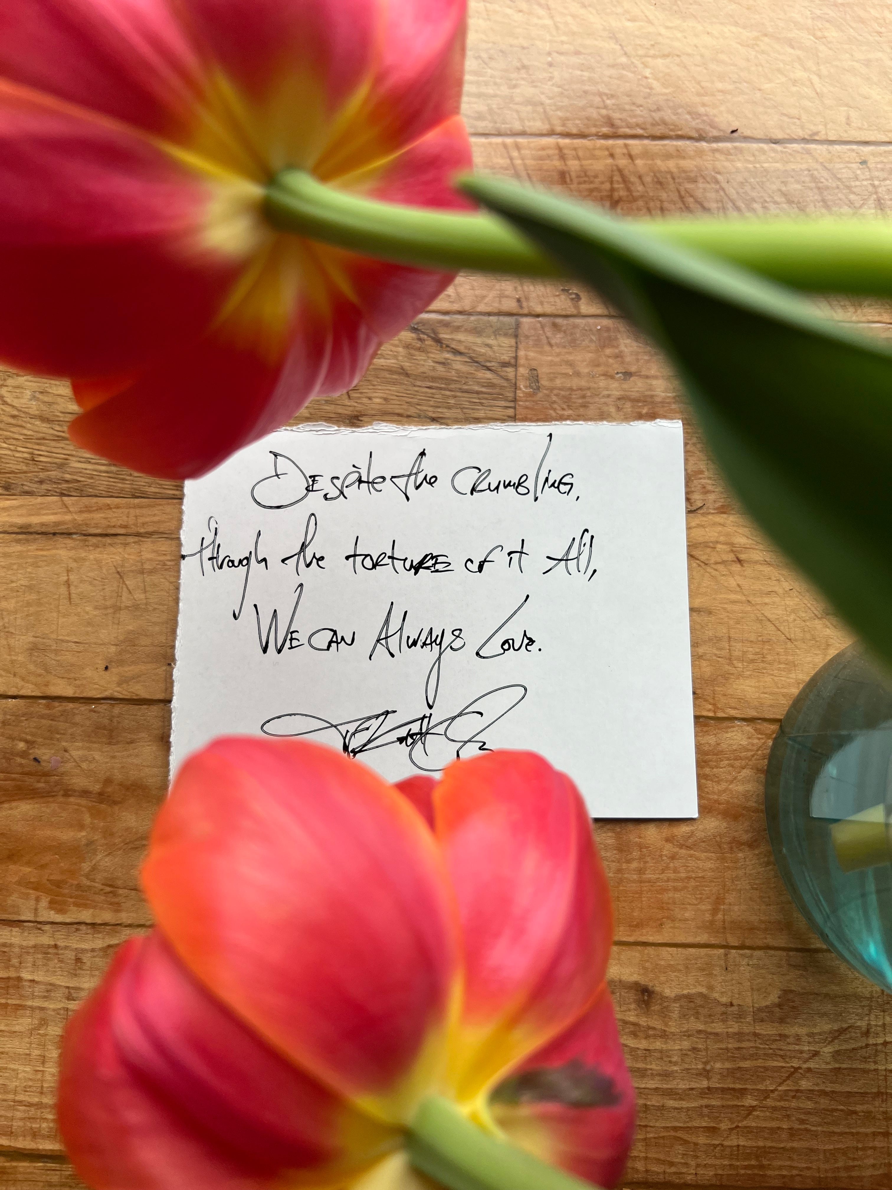 Love is the balance, the slowing of the crumbling, the arms around the arms and the heads in the hands and the slow brush of that dirt from the cheeks of those we share this aching with.