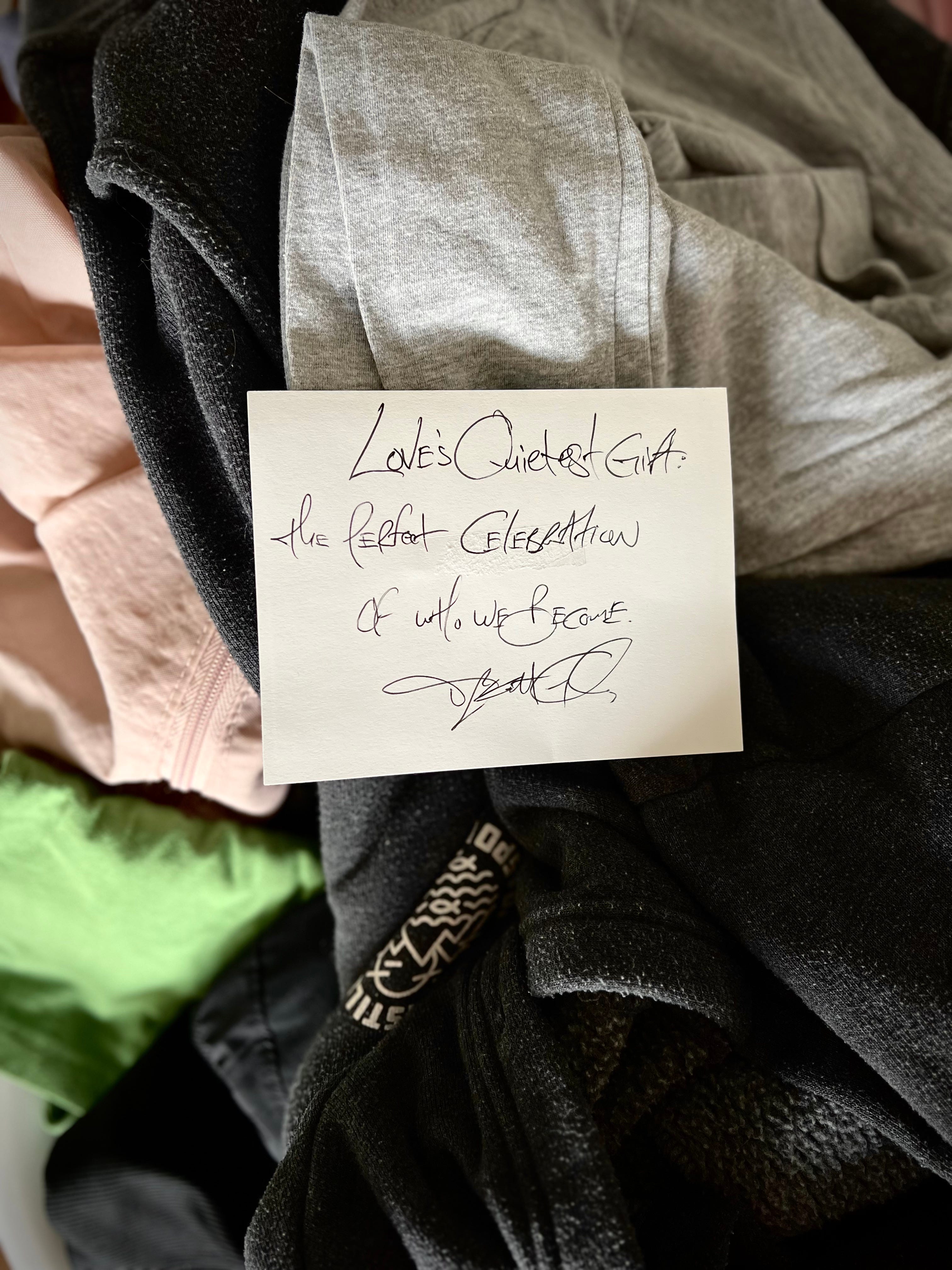 We did this recently, the pile of old t-shirts and sweatshirts holding up the haiku in the photo below can attest, and saw again what happens as some clothes become workout clothes, whilst all others get donated away. During this purge, however, we both gained something—or perhaps not gained as we’d always had it—a flooring understanding, a soul-shaking epiphany that re-emerged within us like a slumbering thing finally shaking the cobwebs of dream from their mind.
