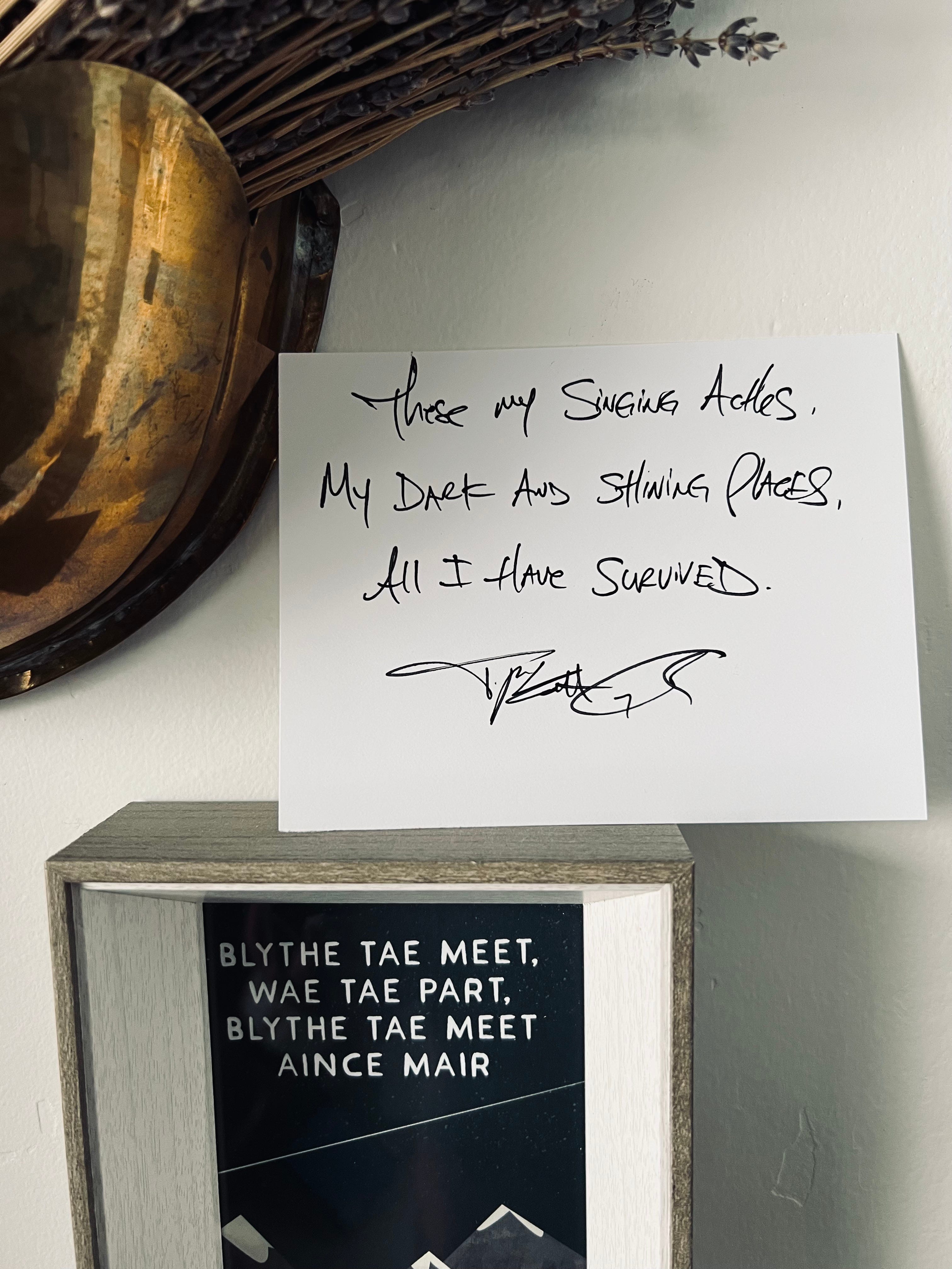 The point is, friends, we’re all filled with dark and shining places, and the amount of acreage those places take up in us grows exponentially as we age, as we experience, and as we survive and thrive our way through a life. Toss in extraordinary sets of circumstances like those we’ve been presented with over the last, hell, 7 years, and we’ve got enough land inside us to start a whole new world. Our job, as humans, as artists, is to provide the means for those places, those aches, to have a voice of their own, to sing with them at the top of their lungs. Everything I have ever written and shared with all of you has been this, the shouting of the emotions inside. It’s all the hurt, the betrayal, the romance, the passion, the sex, the sadness, the joy, the loneliness, it’s all of it at once, it’s all of it singing out in lyrics I don’t even understand until they are down on the page. I am beyond lucky that you listen, that you lean your ears in to hear those words, that you bother to care enough to share them, to hold them close to your own hearts, to let them inspire Your words, your songs. It’s why I always say thank you, it’s why I always say I Love you at the end of these silly Signal Fires, because truly, I Do. You hear these singing aches, these stories of all I have survived, and instead of running away with your fingers in your eardrums, you stay. You stay, and you hear, and then, for reasons I will never quite understand but always treasure, you join in.