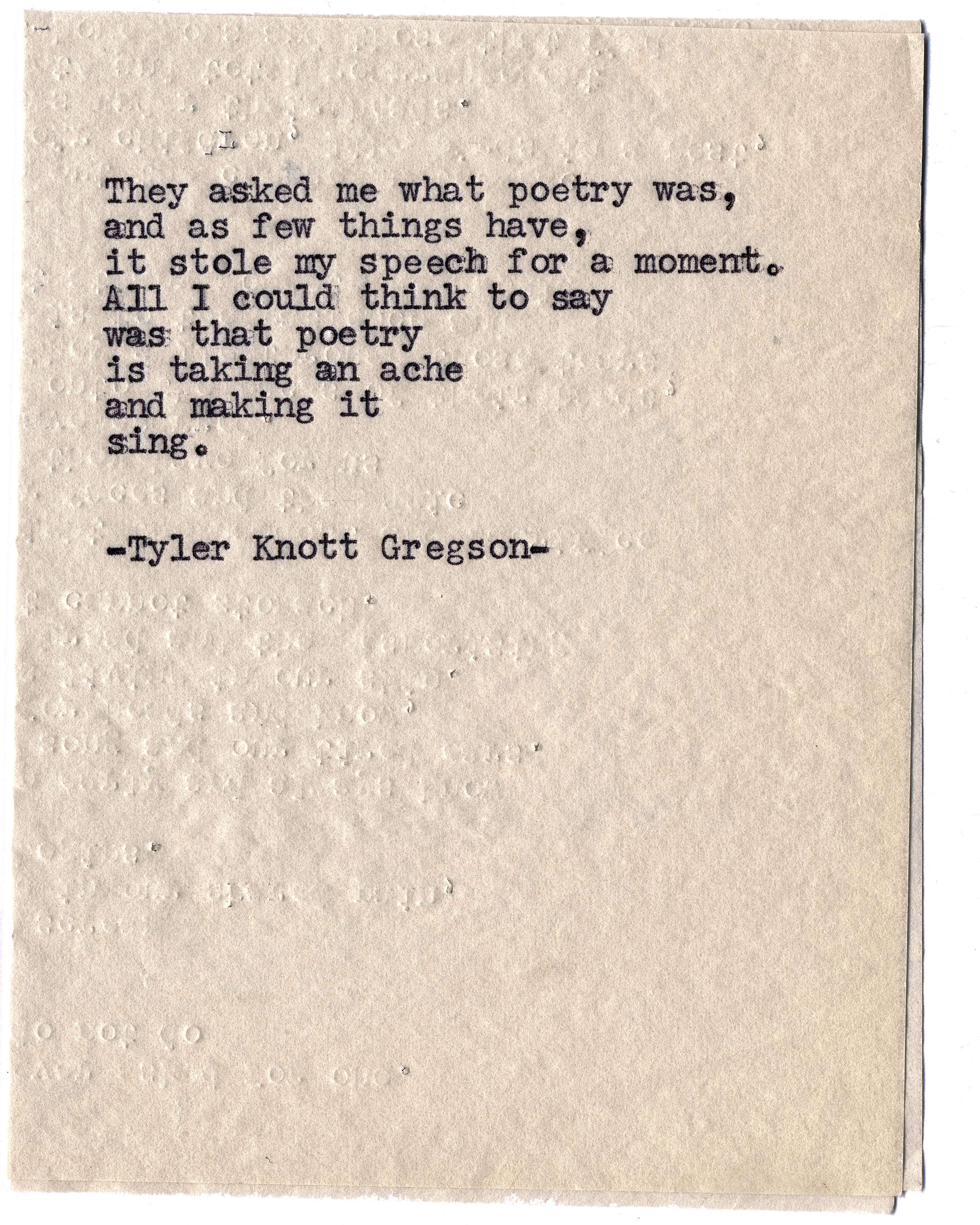 Problem is, anytime I try to describe just how I go about this singing, or at least the providing of the space for said singing, I’m about as helpful as a porcupine waiter at a balloon animal party. I have no idea what that means. If I had a dollar for every time someone in an interview, a Q&A, an email, or a direct message asked me what my ‘creative process’ is for writing, well, I wouldn’t need to write these Signal Fires, and I sure as shit wouldn’t need to beg you all to jump behind the little paywall and join the subscription supporters. Every time I’m asked, I try my best to explain how the complete and total lack of a process is in fact a process of its own. That I just do what Hemingway said, sit down at a typewriter and bleed, only I don’t want to say that because it’s bit melodramatic, but then again, saying that my aches are singing is probably just as ridiculous. What’s more, once I was asked to create a little ‘course’ of sorts about precisely this. About what it takes and what it is to write a poem, and some tips and tricks on how to do so. I suppose people think that once you write over 3000 typewriter poems, every single day for over 3000 days, you know a little something about. I suppose going 12 years without ever missing a Daily Haiku on Love, makes people believe you’re a hell of a lot smarter than you are. I suppose I’m just really good at fooling everyone into thinking I have ANY idea at all what I’m doing, when in reality, I’m just flying by the seat of my proverbial pants. Today, I decided that in lieu of me trying again to express what I already tried to express in said course, I’d give it to you all for 50% off what I usually ask for it. It was already on sale, and now you can have it on sale again, for 50% off, cause why the f not. Click the little button below, or go to ChasersOfTheLight.com/shop and you can add the “Poetry - A Course of Sorts” to the cart. Enter code: SINGINGACHE and it’ll apply it. You’re welcome, I think. I have no idea if you’ll find anything of worth in there, but I do think so as those who have tried it before have really liked it, so that’s something. IF you do give it a go, let me know how you find it.