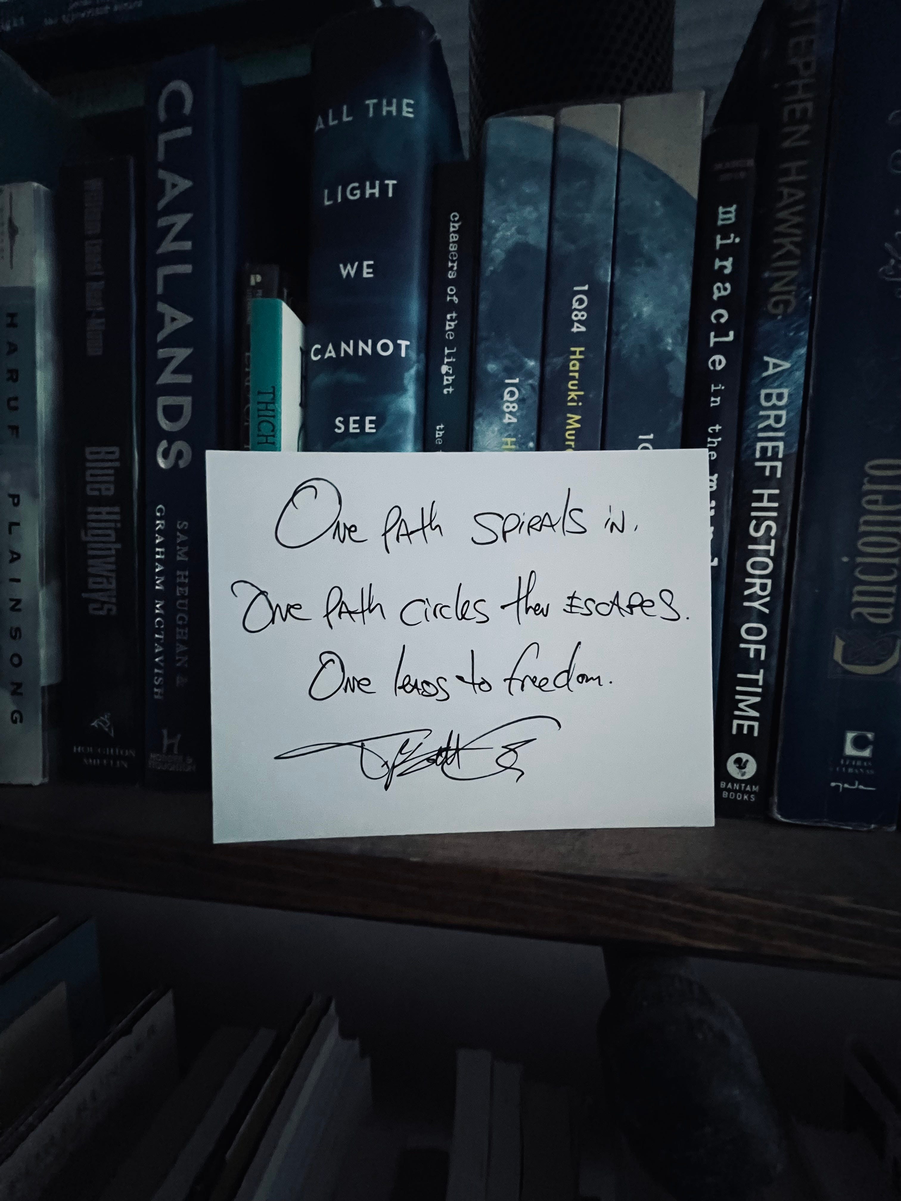 The other circle, the one we should spend more of our mindful and wakeful hours trying to emulate, takes a lap around, sees what is, accepts, and finds liberation in escape. No longer burdened or bound to the endless treadmill of trying to fix everything, shape everything, control the uncontrollable, a kind of freedom emerges. What that graphic does not show, however, is that the longer that arrow flies straight from the circle it came from, the more it will find new obstacles it must orbit around, new laps it must take before escaping again. This will continue forever, until we no longer return and begin again, until we no longer need to. This is the practice of a life.