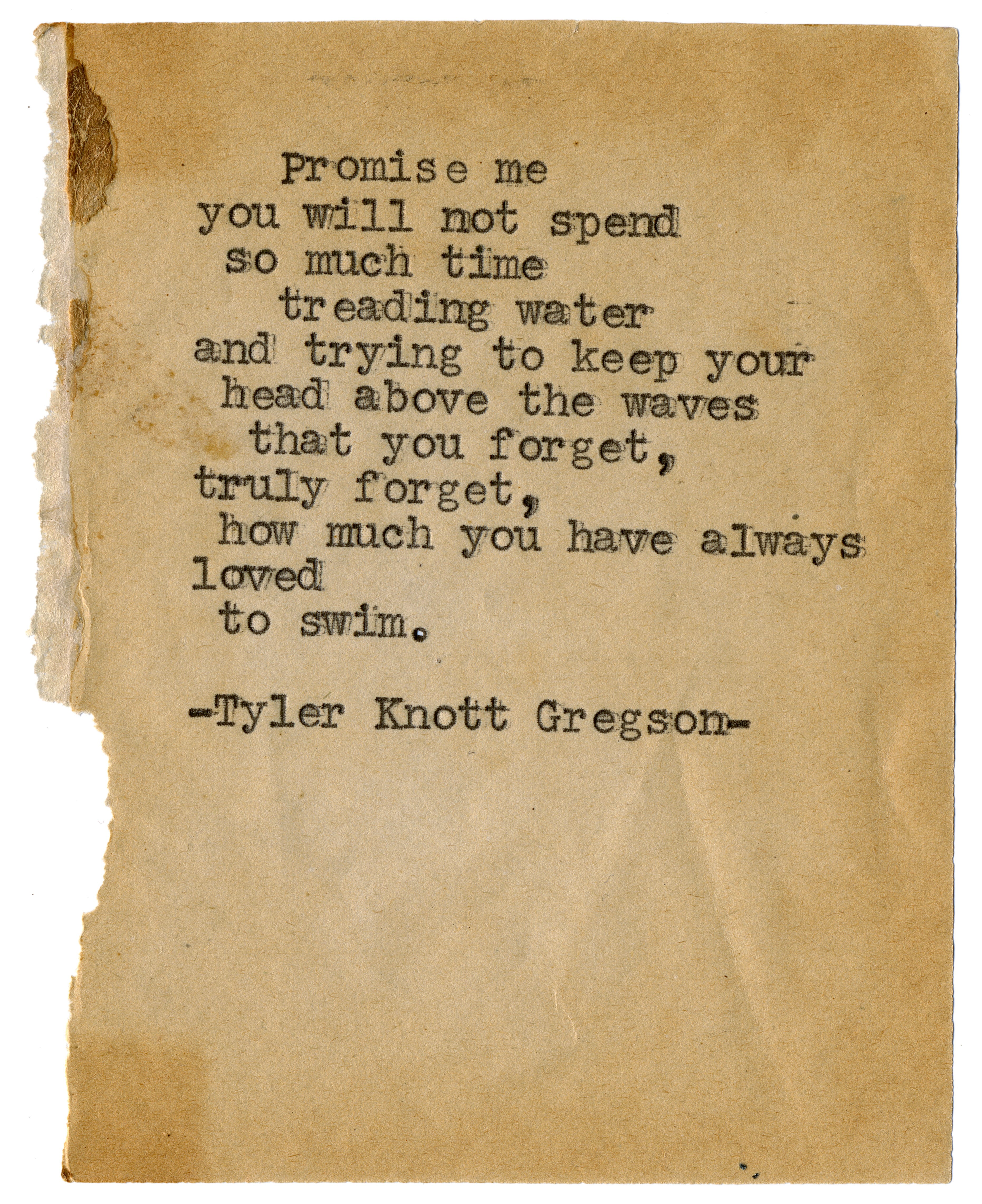 One of the most popular Typewriter Series poems I have ever written is just above, it was Typewriter Series #61 and has gone on to appear in my first book, Chasers of the Light, as well as sold more prints to more countries than I could ever begin to count. (Reminder, I sell prints of every single Typewriter Series poem, sign them, and ship them anywhere, just click here if you’re needing some fun 8x10 photo print arts!) I wrote it to myself, a reminder in my own words, from me to me, for all those times I felt like I was merely treading water in my life, doing everything I could to not sink beneath the churning whitewater of life, of stress, of the chaos that is staying alive.