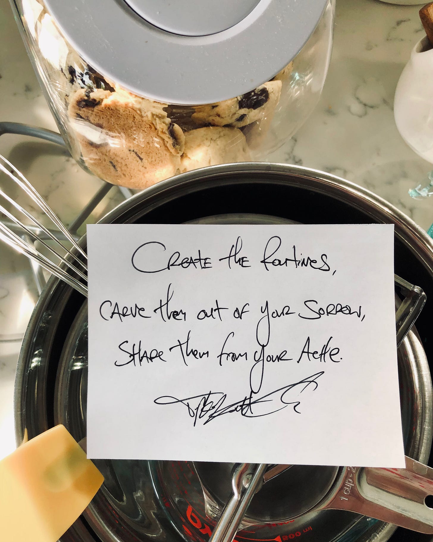 I won’t go over the ten thousand different ways you can soothe yourself, but I will throw out a few examples that I have seen, first hand, work miracles. For Sarah it’s baking and always has been. She bakes when she’s sad, she bakes when she’s overwhelmed, she bakes when someone betrays her, or when someone she loves has been betrayed. She bakes if it’s cloudy, if it feels like Autumn, if it snows and she feels weighed down. She bakes to set herself free. She also bathes, and that’s something she introduced to me and now, overshare as it may be, something we share every day after our workout. Another we share, our workouts. Every day, without fail, we do a workout, even if short, even if brief. We get our bodies moving so our minds don’t fall apart. When the final exercise has been completed, especially in the winter months, we draw a post-lunch bath, and we share it in the darkness. Sometimes, it is only a 10 minute bath, but it reconnects us, and it slows the spin of the world beyond us.