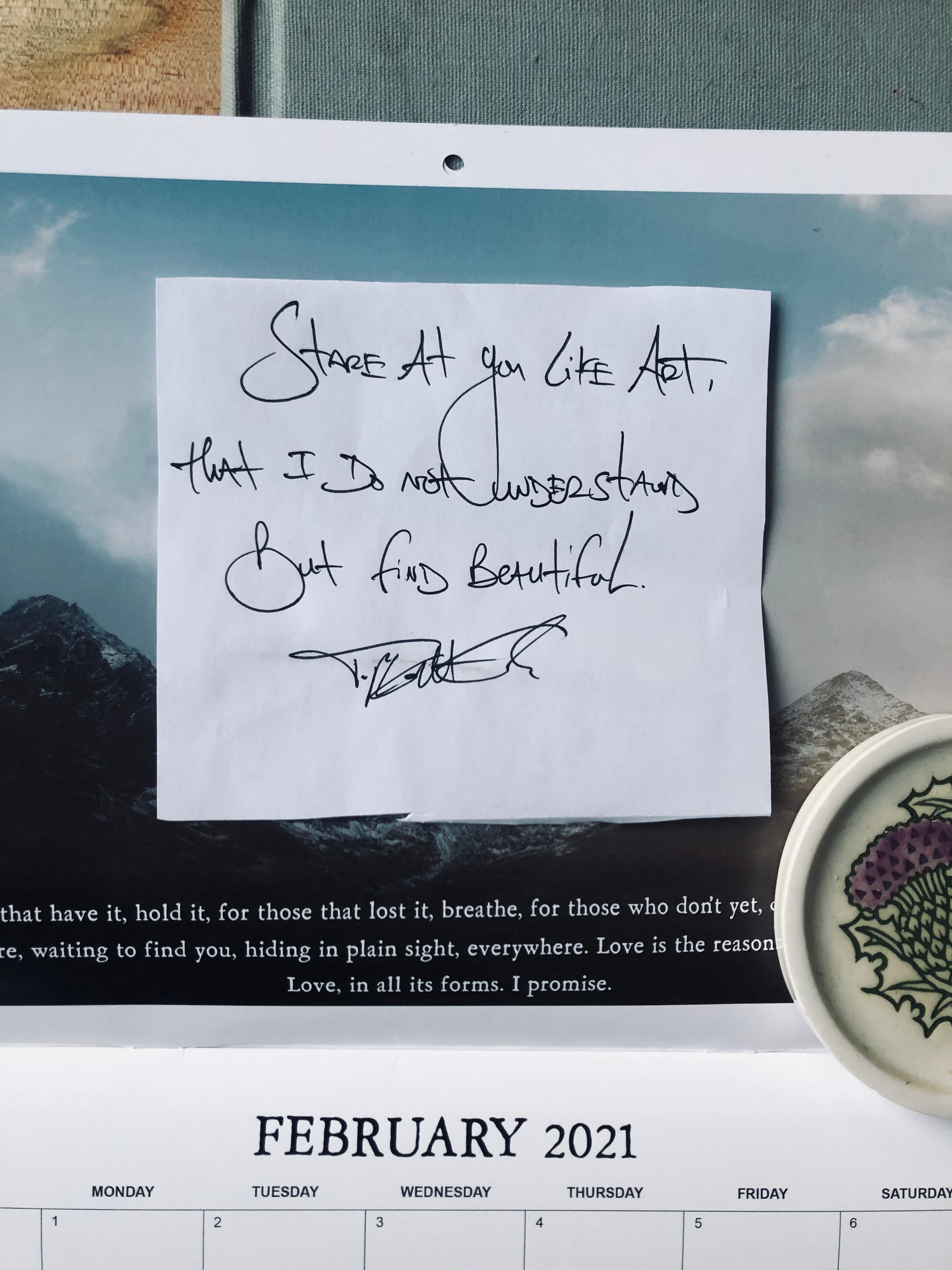 Funny thing about art, for any of you who have wandered through a gallery, sat and stared up at the wall with some piece of canvas and paint staring back at you, and simply gotten lost, is that it does not require understanding to bring forth appreciation, to give rise to awe. We forget this, forget that understanding or being an expert in something is never a requirement to admire and love the beauty behind it. We forget that people are this way, too, that those who wander into our lives, stare at the paint and canvas we call a life and get lost in it, don’t have to understand us to find us the same. We don’t have to fully understand them to see the beauty that shines through all they say, they do, the way they live. What a fundamental shift it can be, finally realizing this, finally putting down the treadmill-like pursuit of total understanding for the people we spend a life with, the acceptance and appreciation despite that lack.