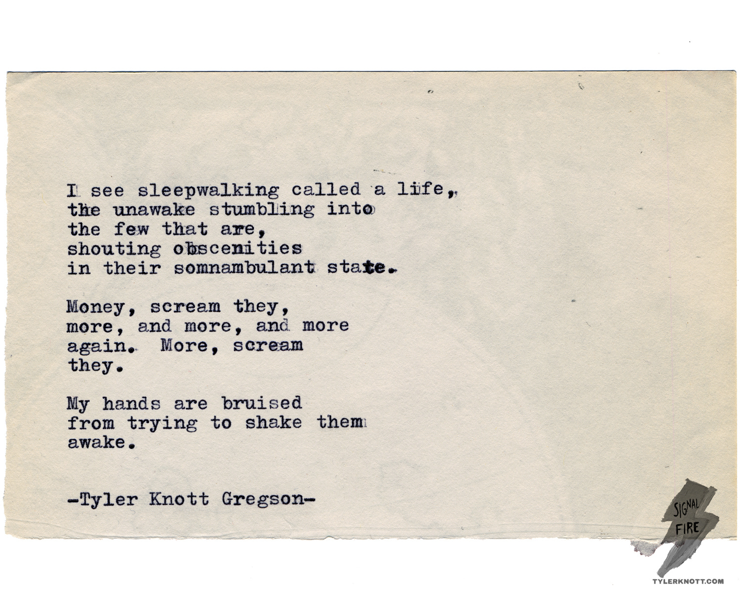 Sarah and I (the poet & photographers) were talking about how hard it’s been to make ends meet as artists, how we’ve been hustling for 16 years. I told our friend, Brett (the musician) that the last time I’d had a boss was when I was 17 years old, and that it was at a discount golf store a friend of my Dad’s owned. We told him how we think every day how we probably should find a “real job” that paid “real money” like he did, something to fund our artistic endeavors, something to pay the bills and take at least some of the fear out of the equation.
