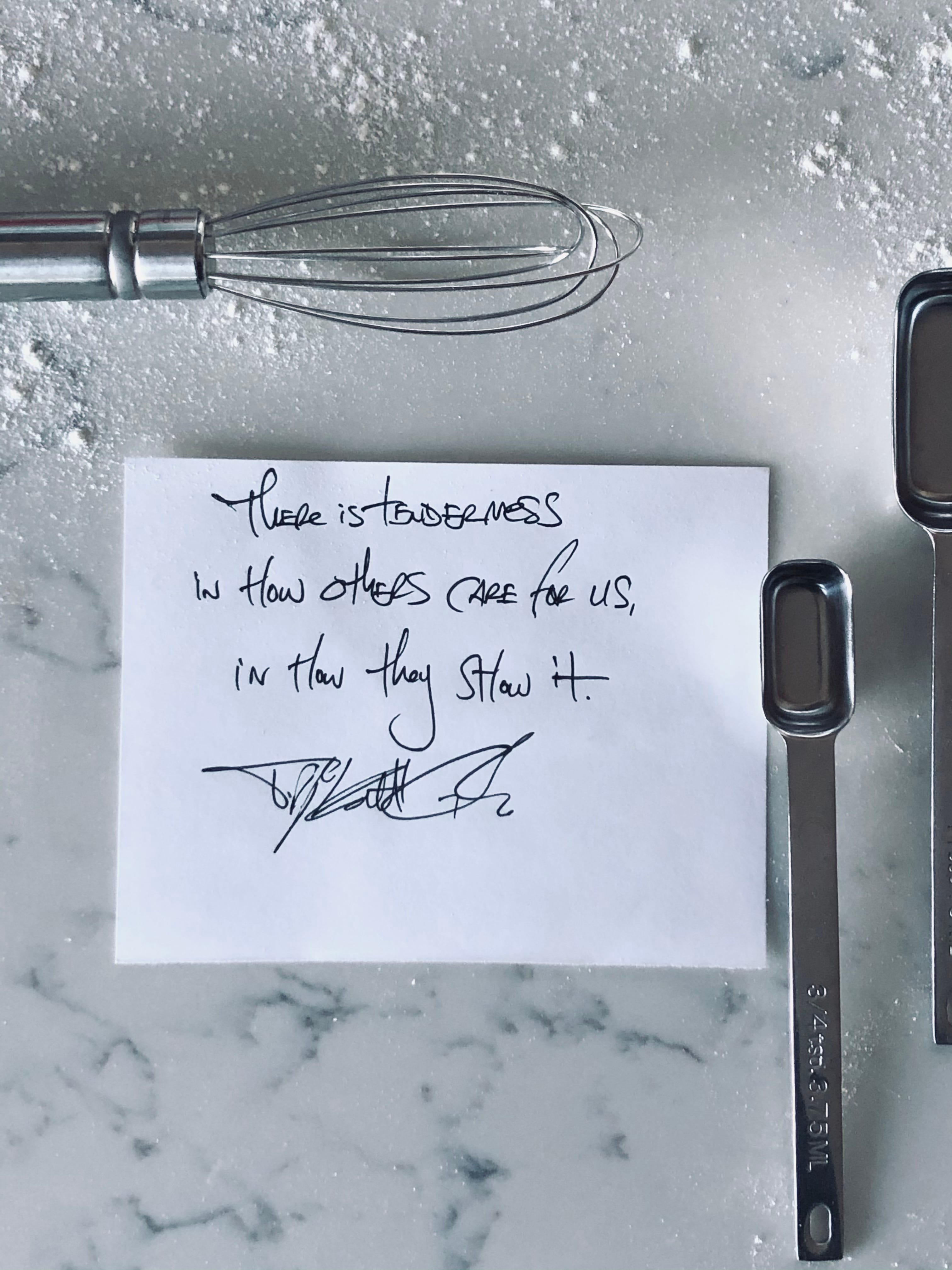Today I’m talking about the second lesson, however, and while it’s extremely helpful having someone like her to take care of you, it’s a lesson we all need to learn and allow ourselves to actually absorb. It’s hard being vulnerable and being taken care of, it’s hard admitting that there are some things we just cannot do on our own, but it’s paramount that we do so. There is tenderness in people, and we must allow them to express it. If we try to control the way that’s expressed, the times it’s allowed to be expressed, we not only censor ourselves, but them, as well. This week, this holiday, allow yourself to be vulnerable enough to ask for help, see their tenderness, and offer your appreciation of it.