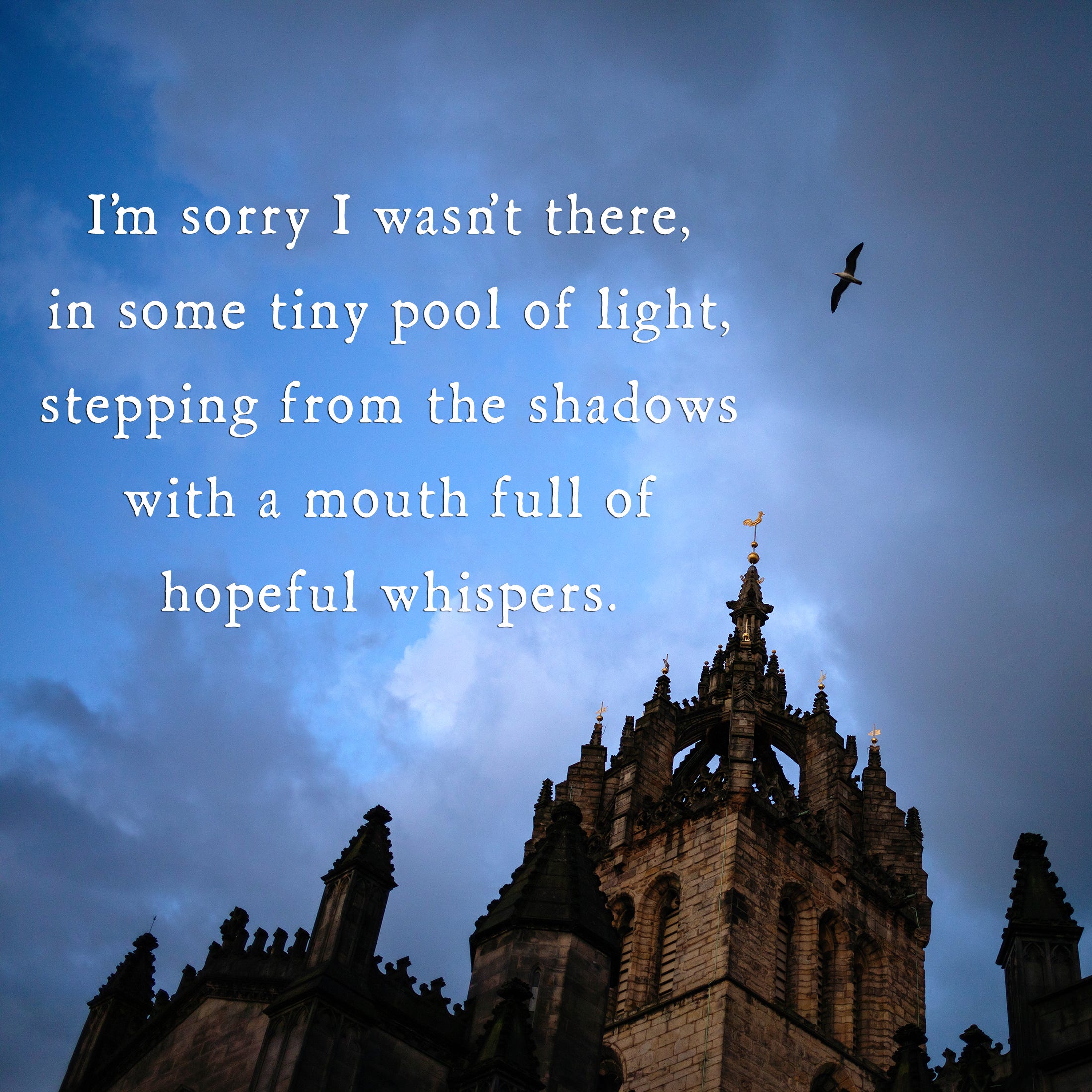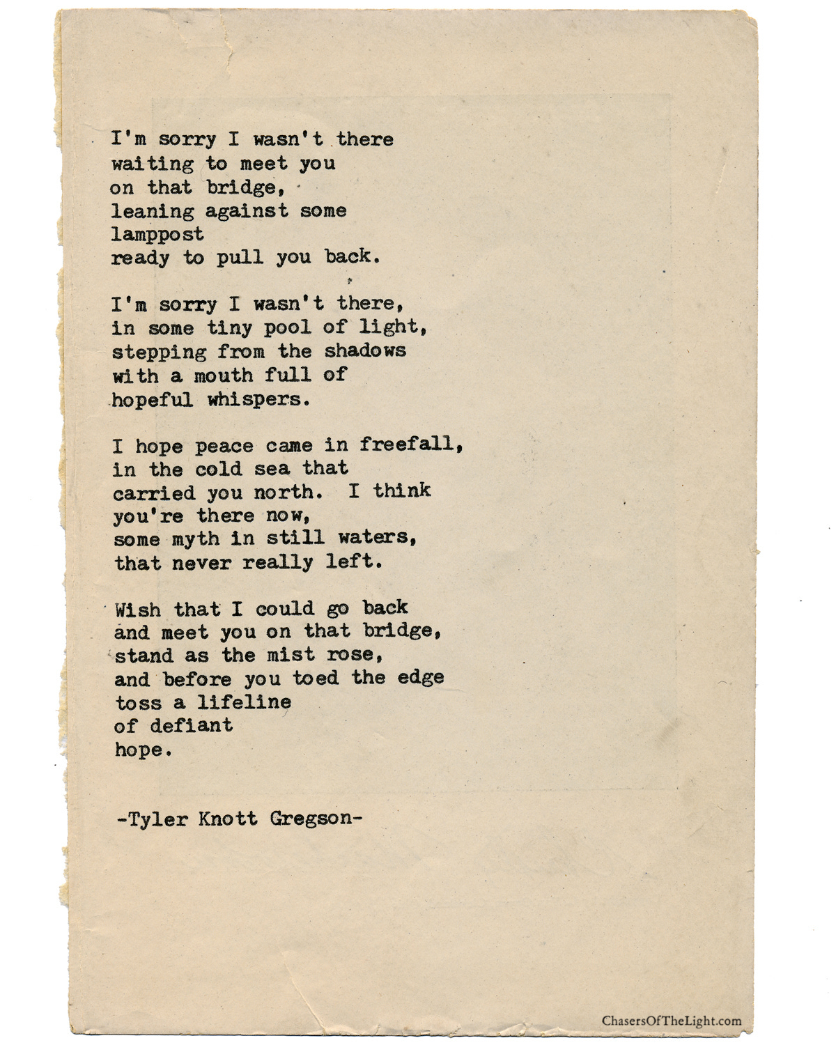 I hope that you, whomever you are reading this little post on this little day, have never had suicide directly touch your life. I hope you’ve never lost someone to themselves, never had to say goodbye to someone who is already gone, never looked in the mirror and wondered if you could have done more (please know it is not your fault), never tried to understand something that is altogether too often un-understandable. I hope so, so sincerely, but I doubt it all the same. I have lost people I love to suicide, and I carry their weight daily. I wonder, daily. This poem, is not about someone I know personally, but the loss of them affected me as though I did, and obviously, still does. One of my favorite bands on earth, Frightened Rabbit, a Scottish band through and through, lost their leader a couple of years back, to suicide. Scott Hutchison was the founding member of this little band, and he sang about sorrow with such passionate hope, that I related instantly, deeply, and personally. His loss was a massive one, as he often sang about the precise way he chose to take is own life in songs before it happened. He leapt from the Forth Road Bridge in Edinburgh one night, and has been missed ever since. This poem, this little shout into the absolute nothing that I can do to help him, is my apology, of sorts. I wish I would have been there, I wish I could have spoken to him, to hold him for a moment and show him how much he means to everyone around him, to me, some goofy guy in Montana. I wish. Please, if you are struggling, if you know someone who is struggling, do NOT be afraid to help, to ask for help, to reach out. If you’re in the USA, call: 1-800-273-8255 or I believe 988 is supposed to be active already. If you cannot find anyone else, reach out to me, and I will do my best. I love you all, please stick around.