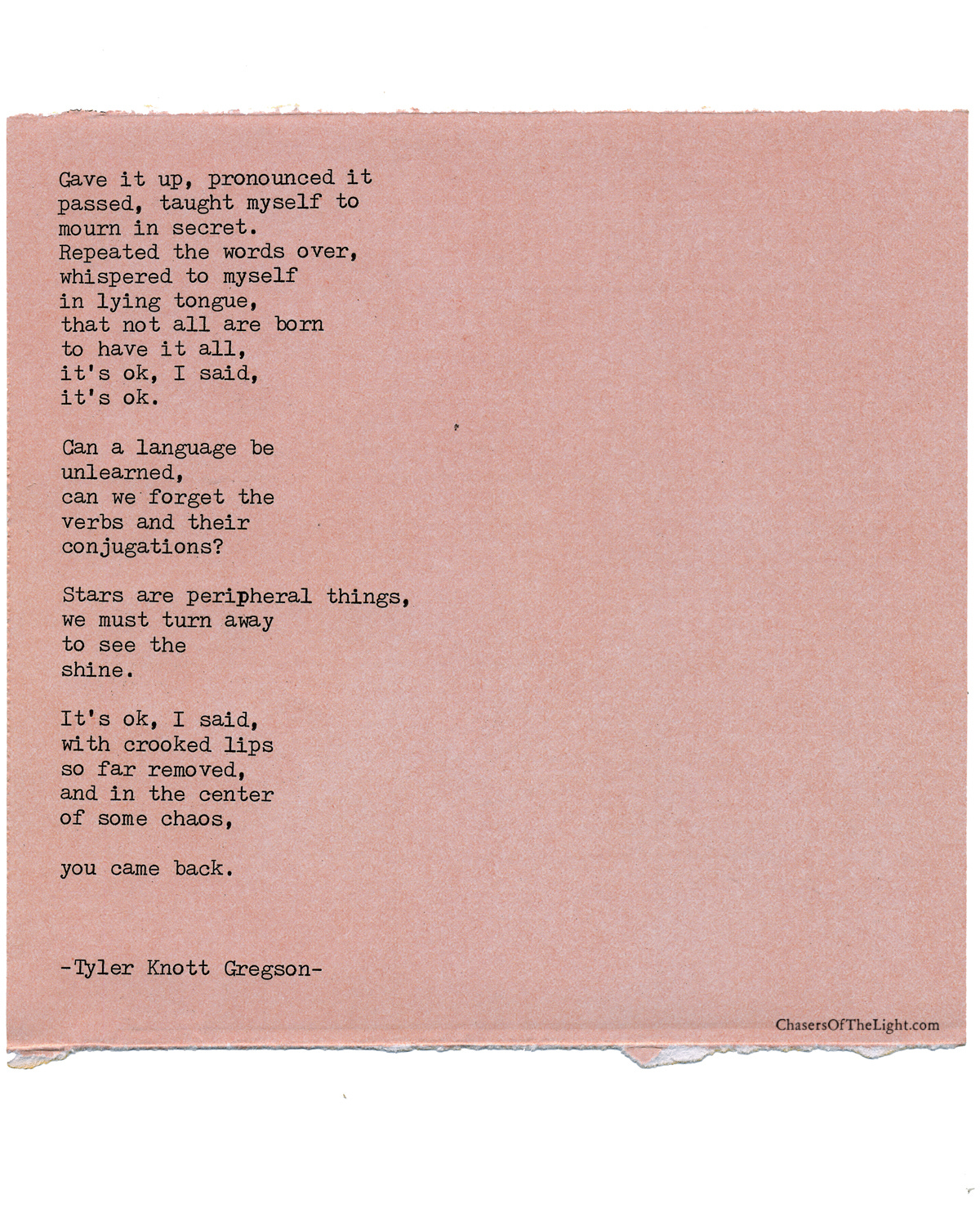 I remember a time when I didn’t think it possible to be lonelier than I was. I remember meals eaten in total silence, one place set, one plate with one fork, and I remember forgetting sometimes to even turn on the light. I remember thinking that I should settle, that I should just forget the dream of finding someone, something that made me feel alive and whole and excited. I remember emptiness as a companion, feeling hopeless and exhausted and worn out. I remember this, and I will never forget, and I am glad for this. I am here to tell you, when you think it over, it’s not, when you think you’ll stay alone, you won’t. When you think there’s nothing worth hoping for or holding onto, there is. Hope, happiness, is like stars, we have to turn away, face the darkness, for the shine to appear. I know this is scary, I know it’s hard being all these things, being alone, empty, forlorn, but there is shine on the horizon, there’s always light coming. I promise you, if you hold on for what you deserve, it will come, it always will come. Today’s poem, was a custom poem written for someone who felt this, who believed this, and then it came. This is Typewriter Series #3064 and if you wish to hear me read it as you read it, click Play below.
