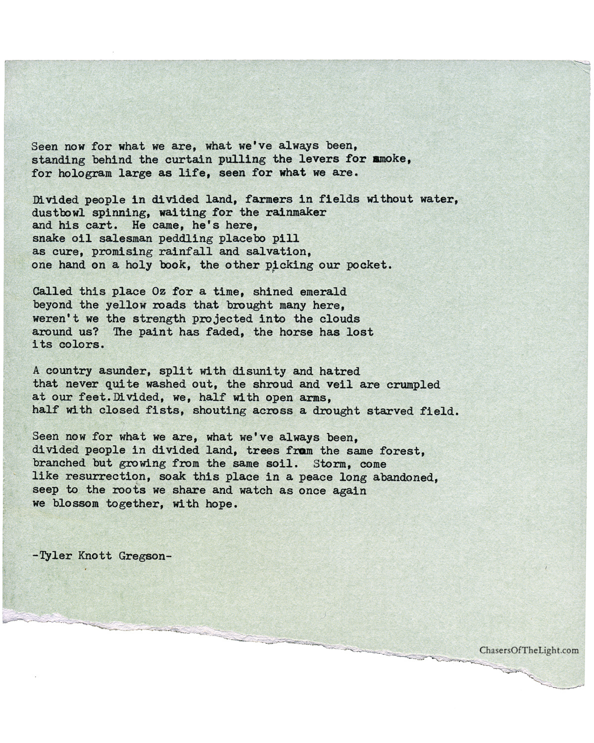 America for all its flaws, all its tragedies, all its misguided attempts to be the big brother of the world, is built on an ideal of hope. We are built on the idea that many can come together to be one, that diversity can, and should, thrive. Along the way we’ve gone so many wrong directions, and in truth, we were built on the back of such evil treatment of entire races of people, this cannot be argued, and it is something I hope we as a country spend an eternity trying to make reparations for. Still, there is hope, and I feel it rising once again. This post is not a political one, it’s a one of simple truth…for the last half decade there has been more division, more strife, more animosity raging in this country than ever before in my lifetime, and probably the lifetimes of anyone else living. Perhaps we can turn things around, perhaps we can remember that we are all one tree with one root and so many branches. Perhaps. We can be beautiful, we can celebrate our differences, we can work together to spread kindness and peace like a forest. Perhaps we start here, perhaps we begin, now. This is Typewriter Series #3065, and I hope you enjoy the video. Below is the typed version, and the audio poem too, if you want to see it without the moving images.