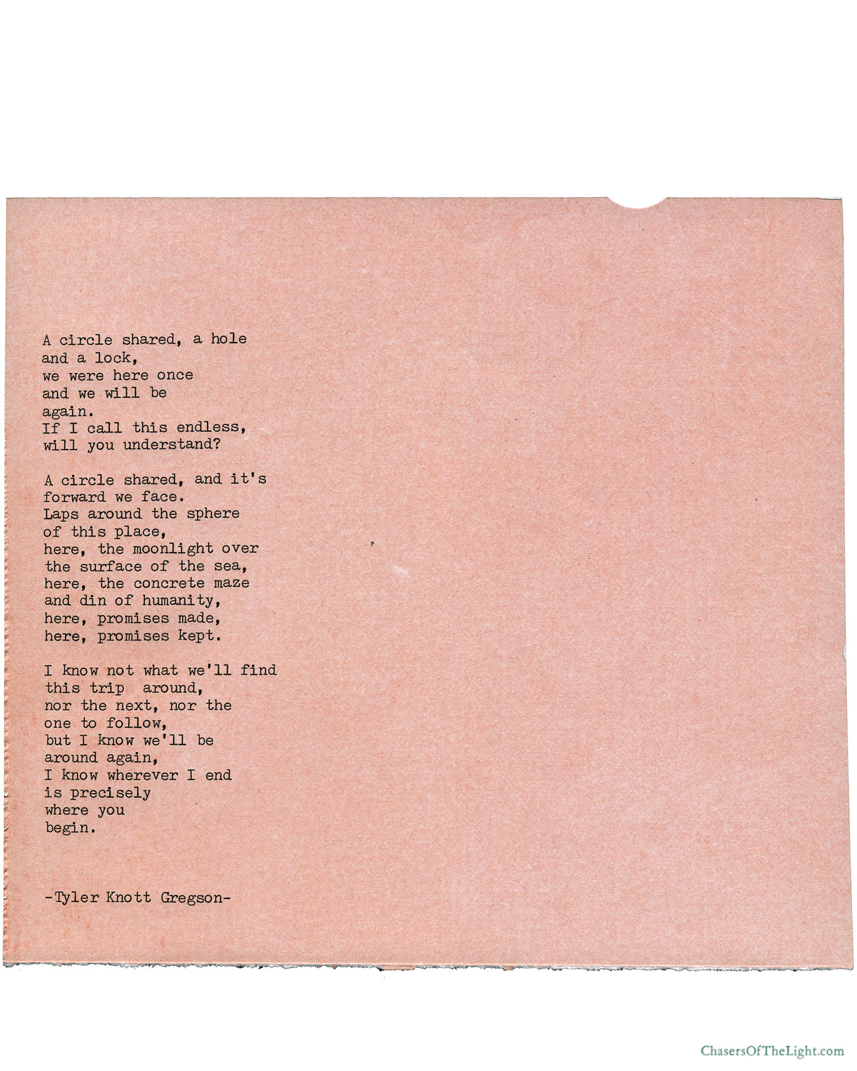 This piece began there, on a detail about twin tattoos of circles that each person shares, one persons became a lock, the other became a hole in a heart, the loss that would be felt if the other left. It started everything for me, “A circle shared, a hole and a lock…” and the rest bloomed from there, growing around the circle motif, but also about all the things in a human life that follow this same circle, this orbit. After all, aren’t we all on this big loop through life?