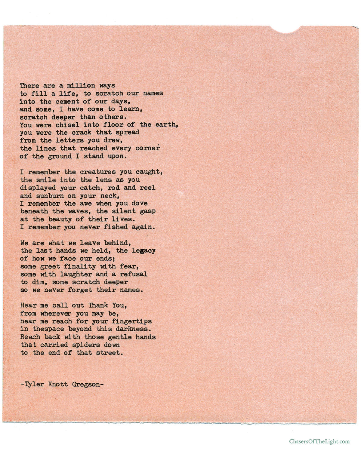 Death comes for us all, we know this. Knowing and understanding, I am learning as I age, are two completely different beasts. We know, from birth we know, that eventually all things must pass, transform into something new. What we don’t understand, is the impact this passing will have when it finally reaches us. Frozen fingers under the backs of shirttails, an emptiness that consumes, a black hole in our lives. This poem, this Typewriter Series #3072, is about death, but beyond that, it’s about how when someone we truly treasure does leave us, something is left behind. Perhaps what is up to us, is to ensure that when it’s our turn to start again, we leave behind something that comforts while it aches, that soothes though it stings. To carve our a life like names in cement that leave those who knew us better for the knowing.