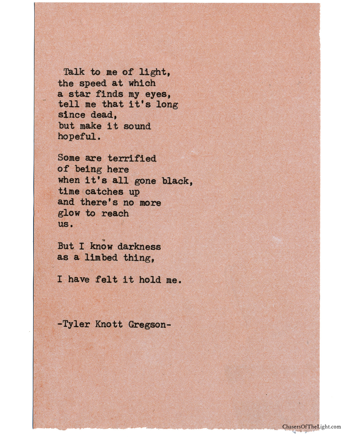 I know the darkness, I’ve felt its fingers, I know the arms of it, call her familiar, and say it in a hopeful tone. This is where this poem comes from, this familiarity, this warm knowing I don’t know what else to call. You can talk to me of starlight, of the miles its traveled, you can tell me every inch of every bit of black in the sky is filled up with galaxies, but still I know the darkness, still I love it.