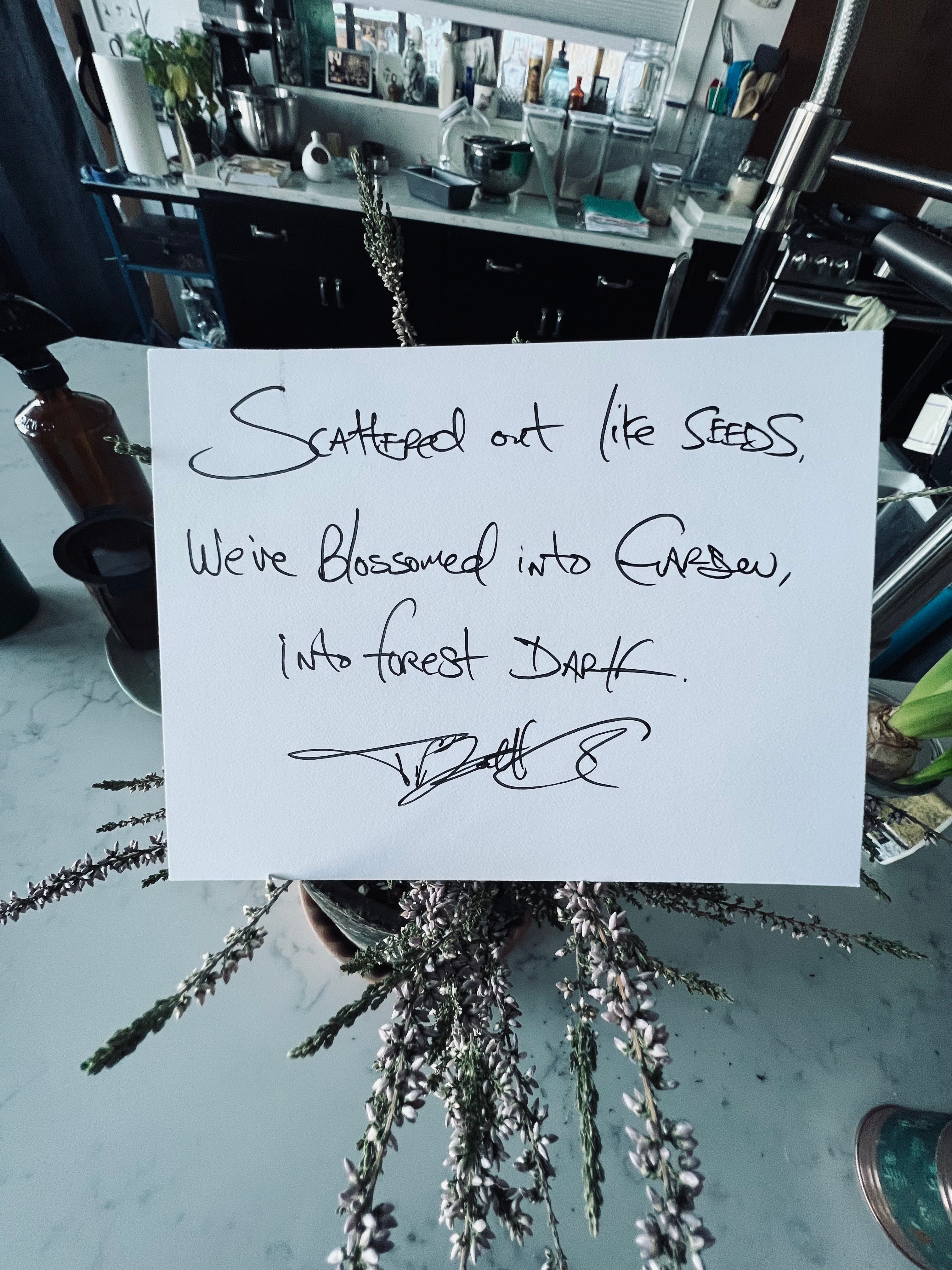 We are many, all of us seeds that came to this place not knowing what we’d turn into, but now we are one thing, too. We started scattered, this is true, but over time and words, over tragedies and humor, over pandemics and mass shootings, marriages, divorces, music, wishes, and words, we blossomed into a garden we never knew we were planting. We turned into a forest, dark, but welcoming. I couldn’t be more proud to know you all, I couldn’t be more proud to be part of what waters this garden, I couldn’t be prouder to grow alongside you, a single seed in a garden wide and absolutely stunning.