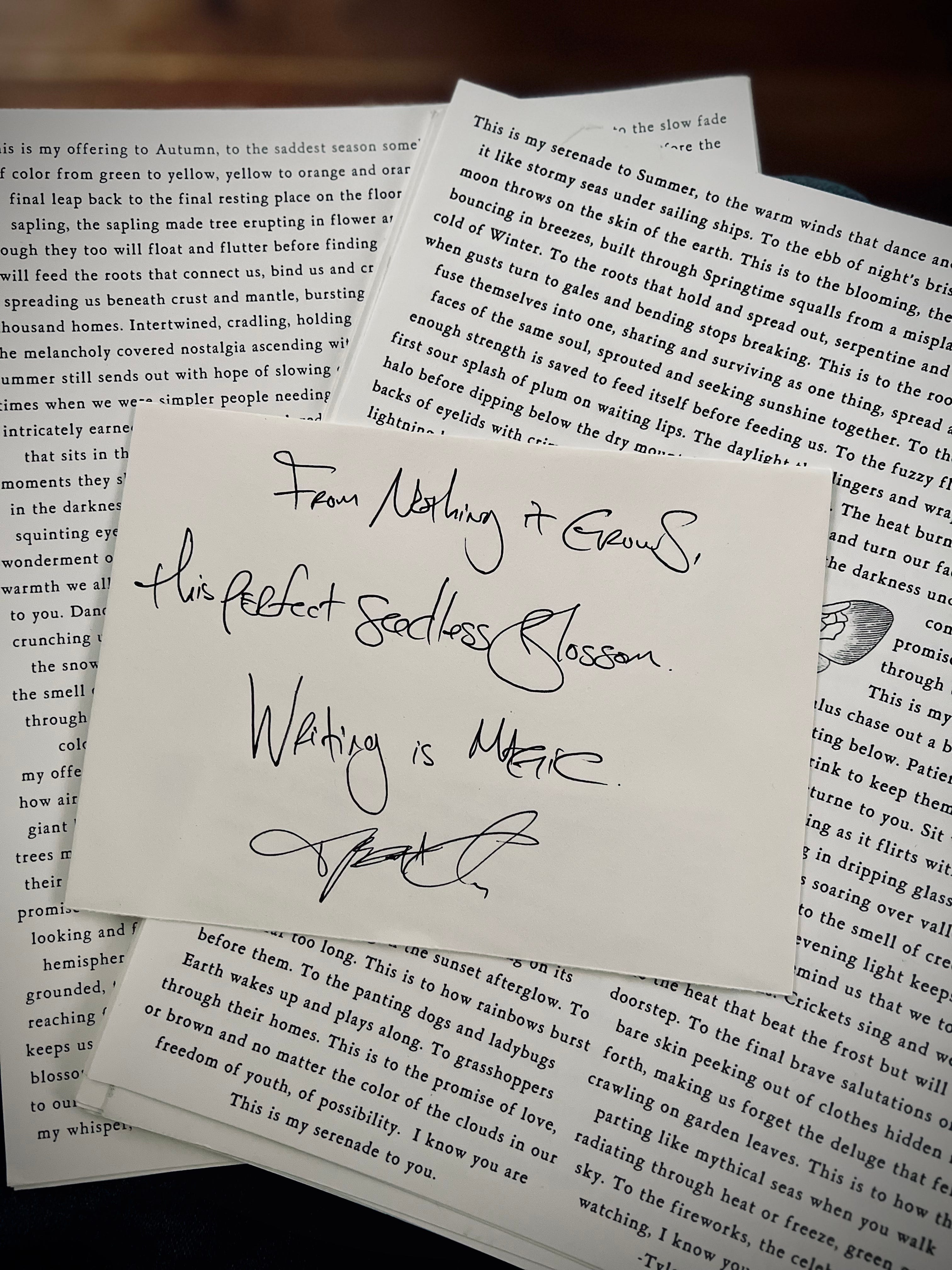 I throw life reboot and writing prompts on The Kindling (the paid-subscriber newsletter that goes out every Tuesday) to try to remind you of this. I prompt you because I want you to be reminded of that magic within you, even if you don’t consider yourself a writer, even if you don’t particularly enjoy writing. I do so because every time you answer, every time you write a single sentence, you’re practicing that art—you’re making your soul grow. (You’re welcome)