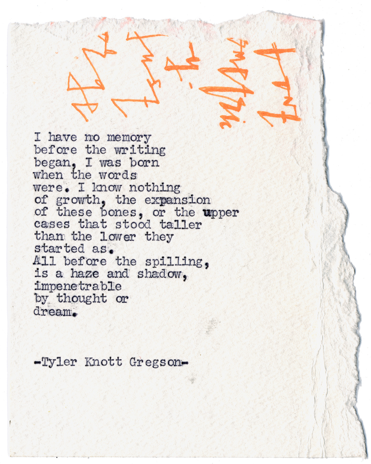 Every time you write, every time you shape poetry, novels, essays, or short stories, you’re conjuring something from nothing at all. I suppose it could be argued that the “material” that writing necessitates is experience, is memory, is imagination, but I think I understand what those that say writing is unique in its lack of material needs. I think one could also argue that at the very least a stick and dirt, a bit of charcoal and paper, a typewriter and an old book page, are also necessary for writing to truly come to life. Maybe not in oral storytelling, in the passing of legend and myth across time, but I digress.