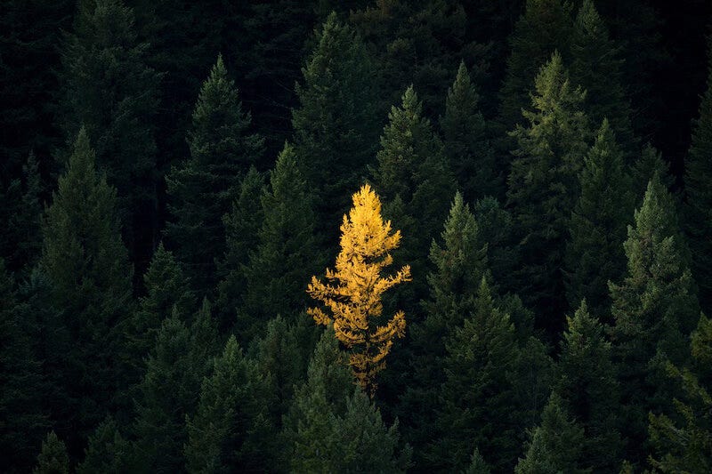 Sometimes I am a woman, sometimes I am a man, sometimes I am genderless, sometimes I am animal, sometimes I am fear, love, hope, or such deep sorrow manifest. Sometimes I am nothing at all, just words. It’s an HONOR writing for all of you, and I absolutely treasure writing custom poetry for you. I’m still doing it, and it takes it out of me, but my goodness I love it. Today’s poem was another custom poem I wrote, after hearing such a beautiful story about a single golden larch tree on a small island in the middle of a lake, surrounded by a forest of evergreens, that were surrounded by water blue-green and fed by ancient waters. These two found this lake, this tree, and told me of it, they spoke of pain endured, of waiting, of all the years that split them apart. Somehow, those words became this poem, and they became that tree surrounded by green. Somehow.